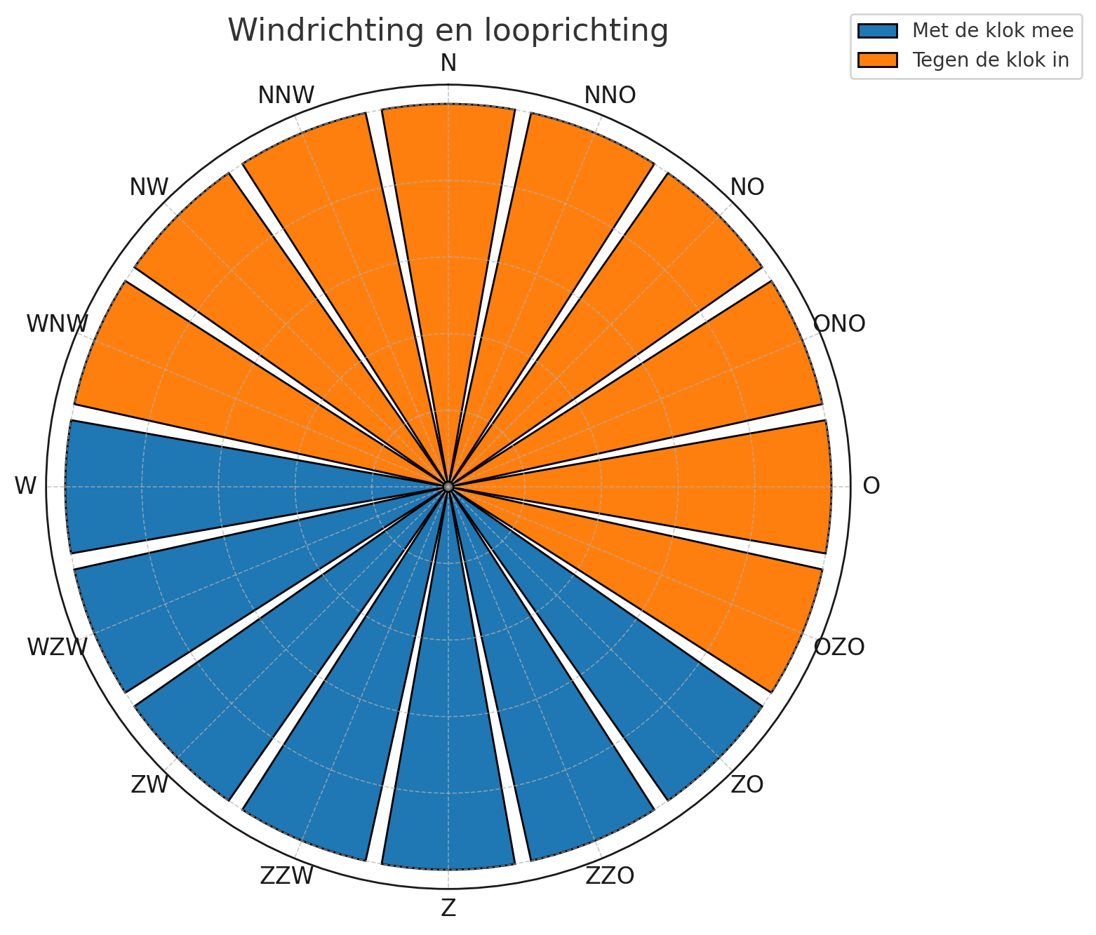 De route ligt vast, maar de looprichting is afhankelijk van de wind. In de figuur hiernaast is aangegeven welke richting gevolgd wordt bij elke windrichting. Bij wind uit het zuidwesten (ZW) lopen we met de klok mee; bij wind uit het noordoosten (NO) lopen we tegen de klok in.